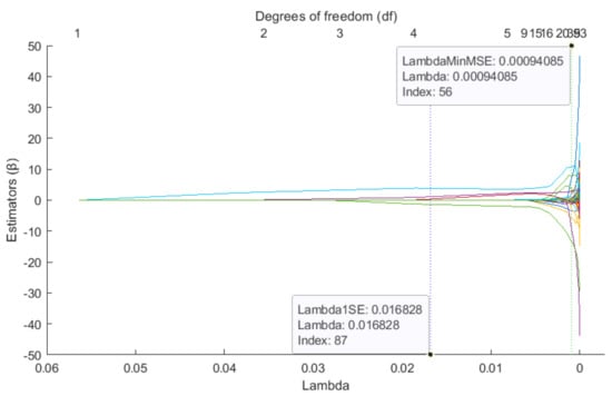 Figure 7 on the lower horizontal axis shows the values of estimators β from the L1 norm. The horizontal axis at the top reflects the degrees of freedom (df), meaning the number of nonzero values of beta (β). Beta values represent the coefficients of a sequence of regression fits, as returned from the LASSO function. B is a (p × N) lambda matrix, where p is the number of predictors. Each column of β is a set of coefficients LASSO calculates using one lambda penalty value. When L1 values decrease, the number of degrees of freedom (predictors) also decreases.