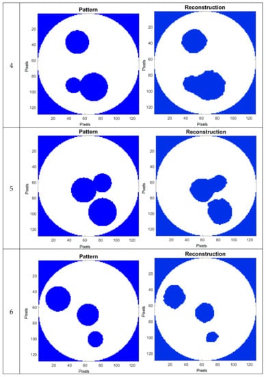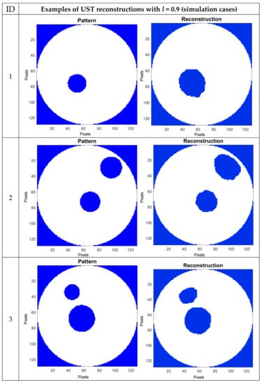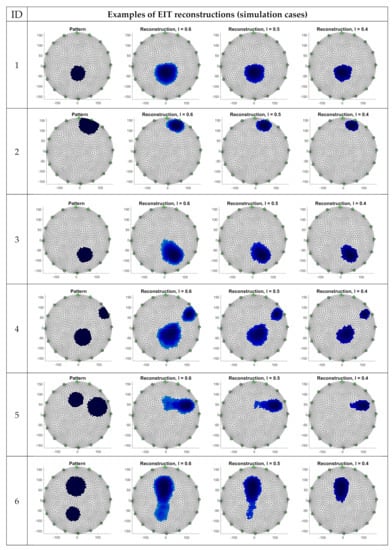 In order to compare cases of reconstruction of EIT and UST, data generated by simulation were used. Figure 9 shows six examples of reconstructions of EIT made using an elastic net and LRS. A pattern image was assigned to each analyzed case, and the performed reconstructions were divided into three variants differing with the applied coefficient l (classification threshold): l = 0.6, l = 0.5 and l = 0.4.