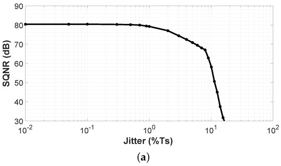 However, jitter present in the sampling clock may have a negative impact on the performance of the proposed VCO-ADC. Jitter can be seen as a deviation of the sampling period from the ideal value and, in real implementations, its presence may be unavoidable [30]. Some approaches for the jitter sensitivity reduction in CT-s have been published, for example in [31,32]. Figure 7a shows the simulated SQNR for the proposed system assuming different values of clock jitter. The SQNR remains without important changes up to 1% of period jitter rms value ( = 50 ns). The performance of the system will be significantly degraded if a sampling clock with a jitter above 1% is applied.