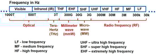 EM spectrum showing the radio frequency, millimeter wave, microwave, terahertz, infrared and visible band ranges [].