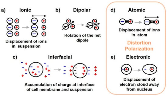Dielectrics, unlike conductors, do not possess free electrons for conduction. However, they exhibit conduction properties under an applied field. On application of electric field, the positive charges in the dielectric get displaced in the direction of electric field and negative charges get displaced in the opposite direction. The conduction properties are attributed to this net charge separation. Polarization is this ordering in space of electrical charges in response to an external alternating electric field and can be classified into ionic, interfacial, dipolar and distortion polarization [] as shown in Figure 2. Distortion polarization can be further classified into electronic and atomic polarizations.