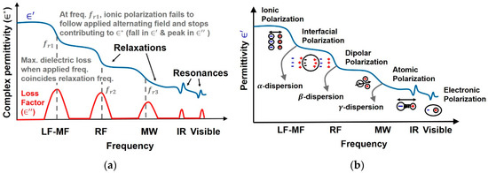 (a) The behavior observed when an alternating field of increasing frequency is applied to a dielectric. Relaxation phenomenon is observed as a drop in real part of permittivity whereas resonance is observed as a trough and peak in succession. Both resonance and relaxation phenomenon cause loss in electromagnetic energy. (b) The order of polarization and relaxation mechanisms observed when an alternating electric field of increasing frequency is applied to biological matter. Ionic diffusion is observed first, followed by interfacial and dipolar relaxations, followed by atomic and electronic resonances.