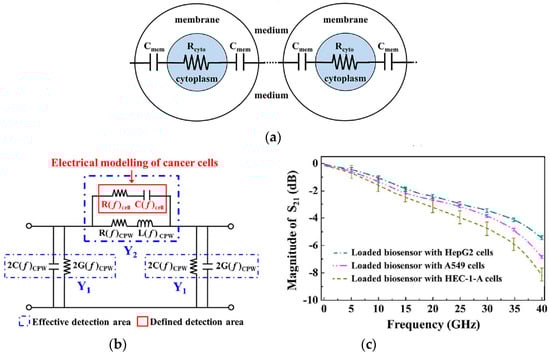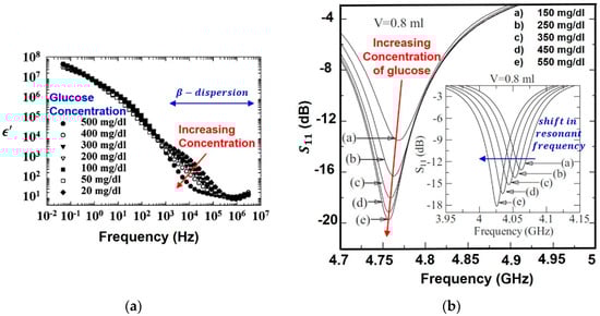 In summary, the variation of permittivity as a function of frequency is known as dispersion. A sharp drop in permittivty occurs at relaxation frequency marked by a loss in electromagnetic energy which occurs when a particular polarization fails to keep up with the fast changing electric field. Furthermore, this permittivity spectrum provides a unique dielctric signature and can be utilized for sensing purpose. The biological target can be biomolecules, like proteins, DNA, biomarkers, pathogenic organisms, hormones, or other medically relevant analytes like glucose, medical parameters like pulse, heart-beat, etc. Biosensing applications include identification of these biological targets such as cancer cells (hepatoma liver cancer cells, skin cancer melanoma cells, blood cancer lymphoma cells), detection of biomarkers [] (prostate specific antigen (PSA) for prostate cancer, Human epididymis protein 4 (HE4) for ovarian cancer), detection of vital signs (respiration and heart rate) and detection of biomolecules (glucose, cortisol, heparin). For instance, in glucose biosensors, as shown in Figure 4a, change in concentration of glucose on the detection surface leads to change in permittivity and shift in relaxation frequency which is detected. In case of biomarker detection, biomarkers are captured at the detection surface leading to a change in permittivity which is sensed. In general, permittivity is different for different biological tissues, providing unique dielectric signatures for all. Dead [] and tumor [] cells differ in their cytoplasmic contents from living and healthy cells due to the presence of pores and blisters [], providing a permittivity contrast. By directly measuring the unique permittivity curves of cells and tissues or by indirectly measuring the changes in permittivity, we can perform the aforementioned biosensing applications.