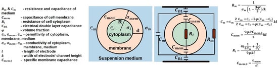 The electrical model of cell in suspension medium helps in explaining the variation of permittivity with frequency, in terms of capacitance and conductivity. Maxwell’s mixture theory [] is used to derive the impedance of a single cell in suspension between two parallel electrodes as shown in Figure 5. The impedance of the medium is represented by resistor and capacitor in parallel. The membrane of a viable cell has very low conductivity and can be modeled as a capacitor , preventing current flow through the cell at low frequencies. The cell cytoplasm is represented by a resistor , impeding current flow through it and the electrode-electrolyte interface is modeled as a capacitor , known as electrical double layer (EDL).