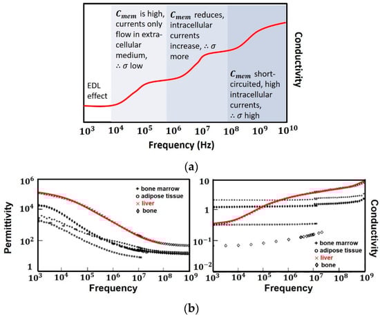 The presence of EDL, reduces detection sensitivity at very low frequencies (<1 kHz) as a majority of the voltage is dropped across EDL. Hence the impedance measurements in this range are of little use in sensing as they are dominated by EDL and are unable to provide information about cell properties (both inside and outside the cell membrane). The cell membrane has an approximate capacitance of 1 . At low frequencies (<1 MHz), acts as an insulating layer and currents only flow in the extracellular medium, accounting for the low conductivity of tissues. Since currents cannot pass through the cell, intracellular information is still not accessible. When frequency is increased (1–100 MHz), the capacitive reactance of cell reduces, increasing the intracellular currents and consequently conductivity. Further increasing the frequency (>100 MHz) makes effectively short circuited, thus enabling the external field to pass through the cell cytoplasm. At these frequencies, the signal becomes sensitive to changes in the intracellular contents achieving maximum conductivity. Figure 6a shows the trend in conductivity on application of electric field to a dielectric and Figure 6b shows the dispersions in permittivity of a calf’s liver [].
