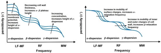 Equation (9) relates the macroscopic quantities to the molecular parameters . We can note from Equation (9) that permittivity depends on the number of mechanisms contributing towards total polarization (through ). As discussed later in Section 1.3, at low frequencies all the mechanisms (ionic, interfacial, dipolar, distortion polarization) contribute towards total polarization and permittivity is maximum (Figure 3). With increase in frequency, the polarizations/dipoles which are unable to align with the fast changing electric field, are dropped, no longer contributing towards polarizability () resulting in a fall in permittivity. As shown in Figure 3, ionic polarization is the first one to be dropped due to its inability to keep up with the increase in frequency of the applied alternating field, followed by interfacial and dipolar polarizations. Permittivity also depends on the number of dipoles in the given volume. Thus, increasing the volume, increases and consequenctly . Hence there is an opportunity to utilize this phenomenon to measure the concentration of biomolecules by observing the changes in permittivity, as done in glucose [], heparin [] and melanoma [] biosensors.