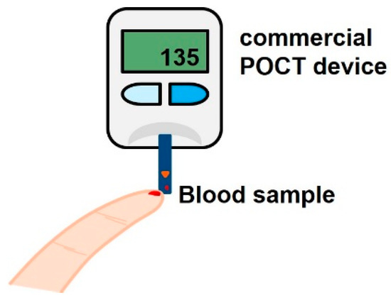 The first medical biosensor , for sensing oxygen during cardiovascular surgery, was reported in 1962 []. Since then there has been tremendous research in this field towards detection of cancer, glucose, genetic disorders and pathogens aiming for better reliability, sensitivity and selectivity while reducing time of acquisition of results. Point of care testing (POCT) [] biosensors are becoming widely popular in the market due to their ability to perform a quick diagnostic test near the patient without the need for laboratory analysis (Figure 8). The commercially available sensors for glucose [], HIV, tuberculosis, cholesterol, hCG (pregnancy), malaria and cancer are listed in Refs. [,]. These biosensors available on the market (Table 2) are based on electrochemical or optical methods. To the best of our knowledge, the only commercially available RF sensor is the vital sign sensor based on Doppler and a blood glucose monitoring device named Glucowise (MediWise, London, UK, Section 4.1.5). However, there is ongoing research in trying to develop microwave sensors with good repeatability and accuracy comparable with the state of the art commercial electrochemical and optical biosensors.