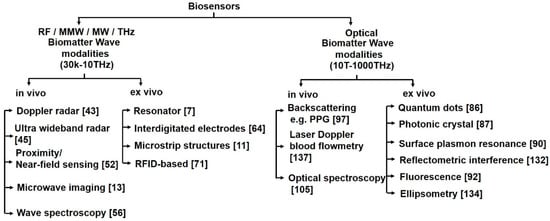Classification of biosensors based on in vivo and ex vivo interaction modality of EM waves with biomatter.