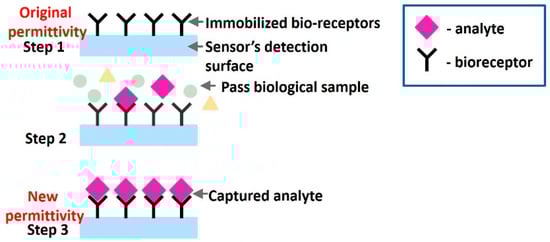 Sensors extensively employ this bio-recognition process, where bioreceptors are immobilized on sensor surface, and the analyte to be detected is allowed to flow across the detection region to selectively interact with the already immobilized biomolecules causing change in permittivity (Figure 10). The sensors are designed to be extremely sensitive to changes in permittivity on its surface which is measured. Apart from immobilization, there is an alternative of using microfluidic channels, which are small channels allowing passage of analyte over the detection area of the sensor, sensitive to permittivity change.