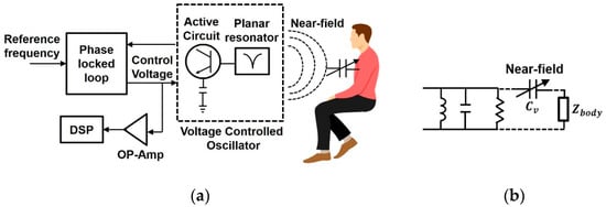 The operating principle of proximity sensor is proposed in [], where a subject is placed in front of a planar type circular resonator sensor operating at 2.4 GHz and is connected to a PLL (Figure 11a). On placing the target in the circular resonator’s proximity, the VCO’s oscillation frequency gets affected based on the dielectric properties of the human and its coupling to the resonator. The resonator can be modelled as a parallel RLC circuit and the human body movement due to cardiac activity as variable capacitance (Figure 11b). The net input impedance of the planar type circular resonator is a complex quantity and varies as a function of separation distance from the subject. Consequently, the oscillation frequency is also a function of separation distance from the subject and is converted to a varying DC voltage by the PLL (control voltage in Figure 11a). Frequency deviation is a critical factor and can be explained from [,] that for lower quality factors the deviation in oscillation is more which turns out to be beneficial for detecting vital signs, since the body movements are quite small to detect. An array resonator operating at 2.4 GHz placed in proximity of a wrist is used in [,] to obtain heart rate information. The reflection coefficient of the resonator/radiator varies as a function of distance between the resonator and walls of major arteries and this information is utilized to obtain heart rate information. Another proximity coupling RF sensor uses interdigital electrodes for planar RF resonator to transform the changes in blood volume to phase variations, proposed in []. The fringing electric fields existing among the fingers (Figure 11b) are distorted by the periodic pulse of the radial artery causing periodic changes in the oscillation frequency which is transformed to a variation in voltage by the PLL. A similar planar resonator operating at 2.4 GHz which acts as a near field radiator, senses vital sign information in [] from the changes caused in oscillation frequency by the periodic movement of the body by respiration and utilizes a surface acoustic wave filter in detection circuit to enhance sensitivity.
