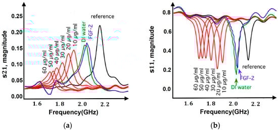 (a) Broadband detection of glucose concentration by observing permittivity over a wide frequency range []. (b) Narrowband detection of glucose concentration using resonator-based capacitive sensing and observing change in reflection coefficient magnitude and resonance frequency [].