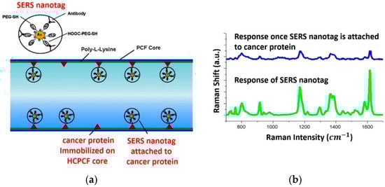 - Dinish, U.S.; Fu, C.Y.; Soh, K.S.; Ramaswamy, B.; Kumar, A.; Olivo, M. Highly sensitive SERS detection of cancer proteins in low sample volume using hollow core photonic crystal fiber. Biosens. Bioelectron. 2012, 33, 293–298. [Google Scholar]