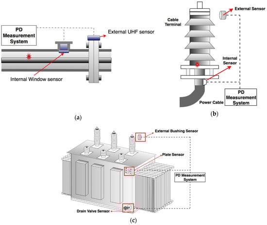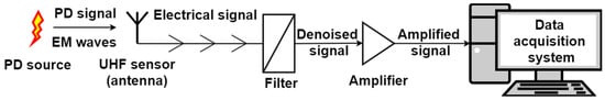 In engineering applications, UHF sensors have been widely used to detect defects such as cracks in physical structures [], displacement and tilt detection in wireless radio frequency identification systems [], and partial discharge measurements in high voltage engineering []. These applications are practically feasible because the transient process of these defects have very short rise times, which results in induced frequency components in the UHF range. As can be seen in Figure 1, a UHF sensor plays a significant role in UHF PD measurement because the initial step of PD measurement is to acquire electromagnetic signals using these devices for further signal processing. To this end, the performance of the sensors will dramatically influence the accuracy and sensitivity of the PD detection system. Considering the nature of the detected signal, UHF sensors can be regarded as antennas since these sensors are required to receive the induced EM waves from the PD source. An antenna is defined by the IEEE Antennas and Propagation Society in [] as “that part of a transmitting or receiving system that is designed to radiate or to receive electromagnetic waves.” Such detection devices are used as energy conversion devices to convert the coupling EM signal produced by the PD source to a current or voltage signal.