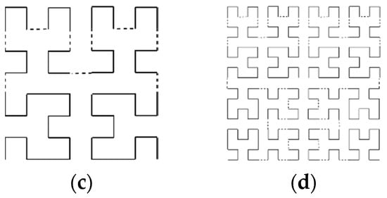 Iterative orders of Hilbert fractal curve: (a) first; (b) second; (c) third; (d) Forth.