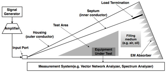 It can be noted that the sensitivity of the antenna increases with higher effective length value. Based on the measurement requirement, the sensitivity of the UHF sensor is at least 6 mm, i.e., the received voltage of the antenna at the specific frequency is 6 mV (RMS) for an incident electric field of 1 mV/mm (RMS) []. In other words, the incidence field is part of a propagation EM wave generated by the PD source and the effectiveness of the antenna is shown as the magnitude of the receiving signal. To investigate of the antenna, the experiment can be conducted using the gigahertz transverse electromagnetic (GTEM) calibration system which is shown in Figure 8. This set of devices can generate a uniform electric field without internal reflection or external interference at a wide range of frequencies. Ishak et al. [] investigated the antenna performance by both finite element time domain (FDTD) simulation and experiments using the GTEM cell, and the results show good agreement. This provides a novel way for UHF sensor design and performance verification. It is preferred that the experiment is conducted using an oil-filled GTEM cell to emulate the condition inside the transformer rather than an air-filled cell [,], because the permittivity of the inner medium affects the propagation velocity and the frequency components excited in the cell [].