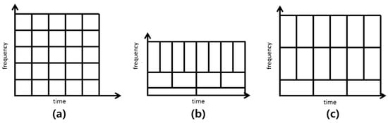 Window shapes: (a) short-time Fourier transform (STFT); (b) wavelet transform (WT); (c) wavelet packet decomposition (WPD).