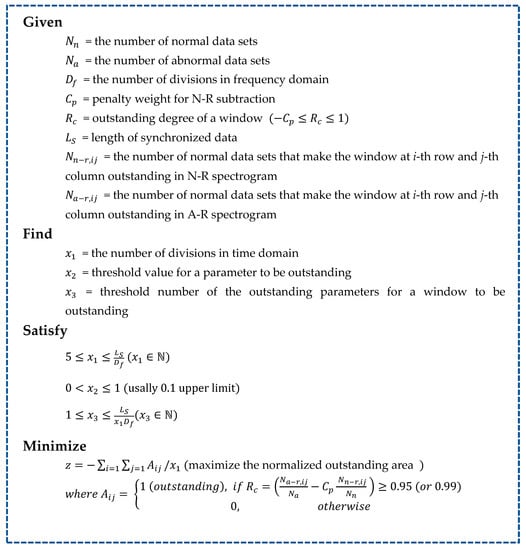 Figure 5 shows the optimization problem formulation [] to build the CIM. Our goal in this problem is to minimize the loss of important information. Therefore, the objective function is to maximize the normalized outstanding area (i.e., important regions), which is the number of outstanding windows normalized by the division number in the time domain. As mentioned in Section 2.3, it is important to identify the area where N-R is dominant, which will result in creating a map highly sensitive to random noise (or measurement error). For this reason, we employed the outstanding degree of a window as where is the term that represents the disturbing errors. It is recommended that the of a window be close to one (i.e., greater than 0.95 or 0.99) to be selected as an outstanding window.