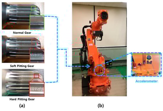 The analysis target is the second joint of the manipulator shown in Figure 6b. As can be seen in the figure, an accelerometer is attached on top of the joint housing to measure the radial vibration []. In this case study, we assumed that the input gear of the second joint could have pitting defects during the operation, as shown in Figure 6a. The top photo is the normal input gear, the middle one is the gear with soft pitting, and the bottom one is the gear with hard pitting. The pitting defects were intentionally created with a grinder for the purposes of testing. Soft and hard pitting defects depend on the amount of scratching on the surface of the gear tooth.