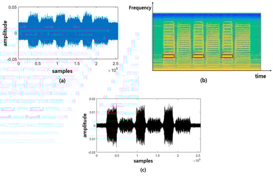 (a) Set of acquired raw signal data, (b) spectrogram of raw data, and (c) filtered data.