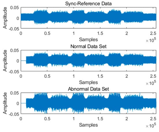 Cross-correlation is typically used to synchronize two different time-series signals. The conformity degree between the two signals is defined as where f is the original function, is the filtering function, and τ is the time delay between the two signals []. We determine the time delay (that maximizes the cross-correlation, , which is . The raw signal is then synchronized with the original signal for comparison by applying the .