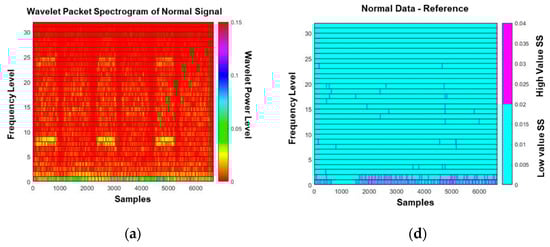 In this study, we performed the spectral subtraction in Equation (8) based on the spectrogram obtained by WPD to identify the critical region of the spectrogram for fault identification. We subtracted the signal spectrum of the normal condition from that of the abnormal condition, which indicates that specific features of the normal condition data are removed. In this study, normal-reference (N-R) indicates the spectrogram obtained by subtracting the reference signal from the normal condition signal. A normal dataset is randomly selected as the reference signal for this spectral subtraction to fix a ground value of the spectral coefficient. Abnormal-reference (A-R) is then the spectrogram derived by subtracting the reference signal from the abnormal one. We mutually subtract between the spectrums of N-R and A-R to obtain the degree of random error, such as measurement error. We discuss the technique to deal with the random error for robust decision-making in diagnosis in Section 3.