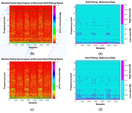 Wavelet packet spectrograms of (a) a normal signal, (b) an abnormal (soft-pitting) signal, and (c) another abnormal (hard-pitting) signal; (d) N-R spectrogram, (e) A-R (S-R) spectrogram, (f) A-R (H-R) spectrogram.
