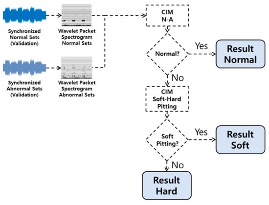 In this case study, we classify the defect conditions (i.e., soft and hard pitting) of the gear, as shown in Figure 11. We first classify an input gear into a normal or abnormal condition, and then classify the abnormal gears into soft pitting or hard pitting defects. Therefore, we develop two CIMs that are for classifying normal, or abnormal conditions with soft pitting or hard pitting. Of the 900 datasets measured in Section 4.1, we use only 5% of them for developing the two CIMs, which are 15 datasets of normal, soft pitting, and hard pitting. The rest of the datasets (i.e., 855 sets) are reserved for validation in Section 4.5. The datasets for developing the CIM were pre-processed following the steps of time synchronization, transformation into WPD spectrograms, and spectrogram subtraction, as described in Section 4.2 and Section 4.3.