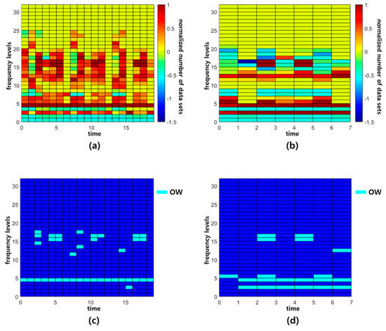 We focus on a specific window as an example to further elaborate details of the classification based on the CIM. Figure 13 shows the SS coefficients included in the window at the 17-th frequency level and 11-th time domain. Figure 13a shows the values of 350 coefficients in the window of an N-R subtracted spectrogram obtained from a normal signal, and Figure 13b shows the same values in the same window of an A-R subtracted spectrogram from an abnormal signal. In Figure 13a, only a few SS coefficients (fewer than 10 coefficients in this example) are above the threshold based on the optimized threshold value for a parameter to be outstanding (0.0089). However, approximately half of the SS coefficients in Figure 13b are above the threshold, which is the reason why the window is selected as OW. We may classify a new observed signal data by investigating the number of windows in the O-R subtracted spectrogram that are outstanding among the OWs in the CIM. We discuss these validation results in Section 4.5.