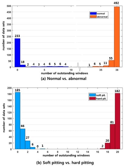 We validated the usefulness of our CIM-based classification based on the 855 datasets that were not used for developing the CIMs. Of these, one third (i.e., 285 sets) are normal, one third soft pitting, and one third hard pitting. The classification results using the CIM for N-R vs. A-R are shown in Figure 14a. The bulk of the normal datasets include no OWs among the 38 OWs in the CIM. The maximum number of OWs of normal data is nine. On the other hand, the bulk of the abnormal data (i.e., soft or hard pitting) highlights all OWs of the CIM. The minimum number of OWs of abnormal data is 33. With the reference OW number as 19, we can classify normal vs. abnormal gears with 100% accuracy. Similarly, we further classify the types of abnormal gears using the second CIM for S-R vs. H-R. The two groups of OW numbers can be clearly identified, as shown in Figure 14b. By setting the reference OW number as 10, we can also classify soft or hard pitting with 100% accuracy. This result is obtained with only 5% (15 samples of each type) of the total samples. Moreover, the computation time for the preprocessing of signals and making a decision is less than one second using a personal computer with an Intel® i7 processor manufactured by LENOVO in Hong Kong, China. We believe that this is a promising result.