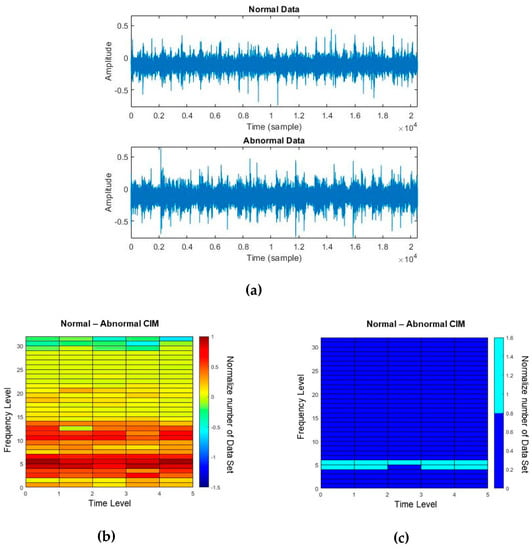 The synchronized signals are transformed into spectrograms by WPD. Each image of the spectrograms includes 6656 parameters in the time domain (i.e., horizontal direction) and 32 parameters in the frequency domain (i.e., vertical direction). Figure 10a–c shows the wavelet packet spectrogram of normal signal, soft-pitting signal and hard-pitting signal, respectively. The distinction between these spectrograms are not clear. As shown in Figure 10b, the area with purple color bars in the N-R spectrogram indicate the regions of significant differences in the parameter values between the normal and reference spectrograms, where the reference spectrogram is an instance of normal spectrograms. Compared with Figure 10d,e, we can observe that the size of the purple area of the S-R spectrogram is greater than that of the N-R spectrogram. This indicates that the difference between the abnormal (soft pitting) and reference spectrograms is greater than that between the normal and reference spectrograms. To distinguish the abnormal signals from the normal signal, we need only focus on the purple area highlighted in Figure 10e and not in Figure 10d. A similar phenomenon might be observed when we compare the H-R spectrogram in Figure 10f with other subtracted spectrograms. It is a reasonable assumption that the purple area highlighted in Figure 10d is from the random noise as we randomly select a normal signal as the reference signal. This screening process is essential for making a robust decision insensitive to the random errors in measured signals for the diagnosis of abnormal conditions. This process will be performed in the CIM optimization process discussed in Section 4.4.