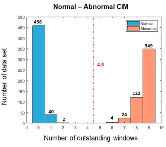 Table 3 shows the optimal design variables achieved after optimizing (i.e., training CIM). For the training, we used only 60 normal and 60 abnormal data sets in this case study; whereas Eren used a total of 260 runs are used in both normal and abnormal cases []. Figure 15a shows the raw signals of normal and abnormal conditions. Figure 15b shows the CIM obtained after the training process and Figure 15c the nine OWs selected for classifying normal vs. abnormal conditions. Since the number of OWs of the CIM is 9, we can divide normal vs. abnormal by half of 9, which is 4.5. Figure 16 shows that 500 validation data sets can be clearly classified with borderline.