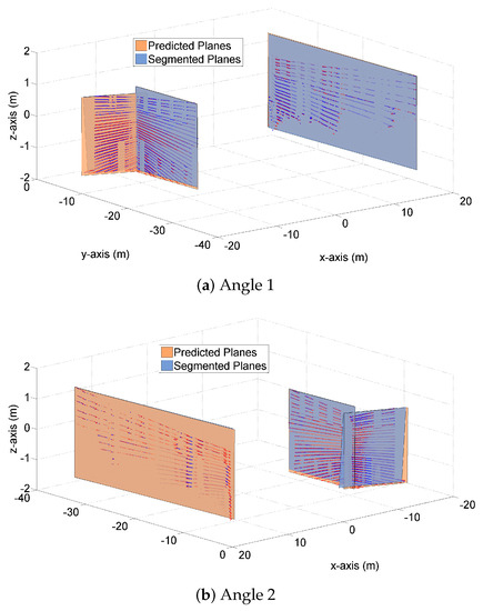 Figure 4c shows a ‘side view’ of the three pairs of planes, from which we clearly see that the predicted and segmented planes (and their normal vectors) almost coincide. Similar results are also observed in
