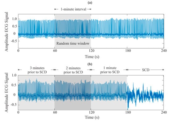 ECG signals for a: (a) healthy subject and (b) subject with an SCD episode.