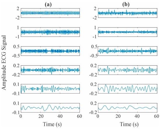 IMF decompositions obtained from an ECG signal of a: (a) healthy subject and (b) subject with an SCD episode.