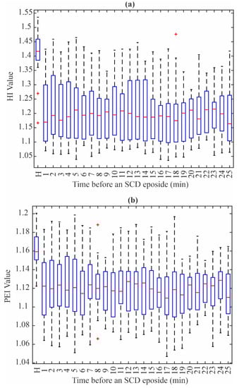 Figure 4a,b show the HI value distribution using IMF 3 and the PEI value distribution using IMF 5, respectively. The normal patients are denoted by the letter N, whereas the remaining boxes show the PEI and HI values, respectively, in 1 min intervals up to 25 min before the SCD event. From these figures, it can be seen that there is an evident difference between the values from the N group and the group with an increased risk of suffering an SCD episode. In particular, there are some values that are far from the central zone (denoted by the + symbol), which most of the time fall outside of the zone for normal patients. It should be noticed that the ECG signals can be affected by several factors such as age, body positions, the person’s emotional health, among others []. These factors yield to have different cardiac rhythms; thus, different measured waveforms are produced and measured. Nevertheless, the combination of the two indices allows obtaining enough information to generate an accurate classifier.