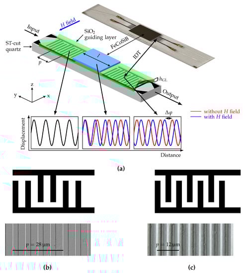 For sensor fabrication, first interdigital transducer (IDT) electrodes are structured by ion-beam etching on a 500 ST-cut quartz substrate. The electrodes consist of 300 Au with 12 Cr adhesion layer to the substrate and to the guiding layer on top and are deposited via magnetron sputtering onto the quartz substrate. The sputter deposition rate is determined for all layers prior final sensor fabrication by profilometry. The IDT electrodes have 25 pairs in a single-finger structure with a periodicity of 12 and a finger width of 3 . For comparison, IDTs with 25 pairs of double-finger electrodes with a periodicity of 28 are used. Apart from the IDT structure, the fabrication process of the sensors is identical. The propagation direction is aligned orthogonal to the x-axis of the ST-cut quartz wafer for shear-wave excitation. A thick SiO2 guiding layer is deposited with a PECVD process covering the IDT electrodes. Finally, a 200 (Fe90Co10)78Si12B10 (FeCoSiB) magnetostrictive layer is deposited by magnetron sputtering from a single target with composition of (Fe90Co10)78Si12B10 and structured using a lift-off process [] to yield the geometry shown in Figure 1. To promote adhesion and prevent oxidation, 10 Ta layers on both sides of the FeCoSiB layer were deposited. During deposition, a magnetic field is applied along the y-axis to saturate the film and introduce an easy axis of magnetization []. The total stack thicknesses for IDTs and MS layer (Cr/Au/Cr and Ta/FeCoSiB/Ta) are controlled by profilometer after structuring. The IDT pitch is chosen supporting the fundamental Love-wave mode and the 1st order mode in the guiding layer with 4.5 µm thickness. This permits excitation of both modes in the same device, while keeping all other material and geometry parameters the same. To achieve this, the IDT pitch and thus the wavelength need to be chosen sufficiently small to enable the wave guide to support higher order Love-wave modes. Hence, the smallest IDT pitch according to the manufacturing limits was chosen and the presence of the 1st mode for this was verified using the 2.5D FEM model described in Section 3.