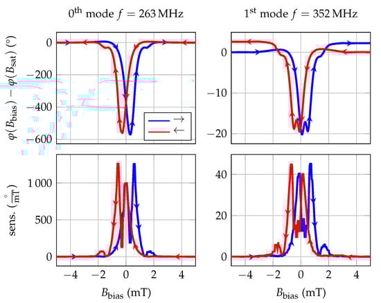 For the determination of the magnetically induced phase shift, the sensor is placed in a homogeneous magnetic field of a solenoid, which in turn is placed in a magnetic-field shielding mu-metal cylinder ZG1 (Aaronia AG) to avoid significant offsets due to the earth’s magnetic field. The calibrated solenoid is driven by a programmable current source (KEPCO BOP20-10ML) to successively generate magnetic flux densities between negative and positive saturation. Due to the expected hysteresis of the magnetic material, the measurement is performed for increasing ambient fields from −5 to 5 and vice versa. The static phase response of the sensor is determined with a lock-in amplifier UHFLI (Zurich Instruments) at a sensor input power of 0 m. The resulting phase responses are shown in Figure 2, in which blue lines correspond to a change of the magnetic flux density from negative to positive values and red lines from positive to negative values. Due to the significant group delay of the sensor , a single-frequency measurement of the phase leads to an ambiguity of . Therefore, the depicted phase responses (Figure 2) are each normalized to the value in magnetic saturation. The measured phase shift results from the delta-E effect, dominated here by the change of the shear modulus. The bias field dependent sensitivity S is given by the derivative of the measured phase change (Figure 2). The fundamental mode is at 263 , exhibiting a maximum sensitivity of 1250/ at a bias field of . The 1st order mode is at 352 and has a much lower maximum sensitivity of only 45/ at a bias field of . To explain this strong reduction in sensitivity, finite-element-method (FEM) simulations were carried out.