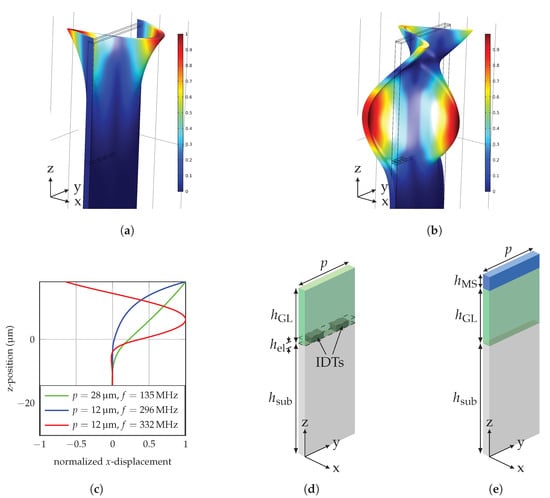Normalized displacement of a delay-line SAW device with and for the (a) 0th mode and (b) 1st mode calculated using a requency domain study. (c) Mode profile of Love-waves at different wavelengths with a 500 μm thick quartz substrate for and a 18 μm thick guiding layer above . Schematic simulation setup of the unit cell for the excitation region (d) and the delay-line region (e). With a width of p, substrate thickness , guiding layer thickness , electrode thickness , magnetostrictive layer thickness and the interdigital transducers (IDTs).