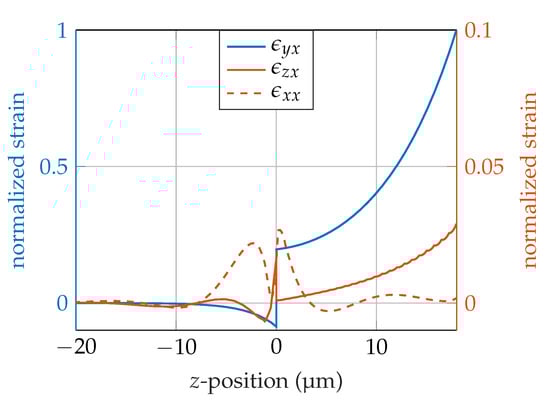 Comparison of strain tensor components of a SAW sensor at the first mode with 18 guiding layer thickness and substrate for . The components are normalized to the maximum of the main shear component . The magnitude of the components and are shown on the right axis.
