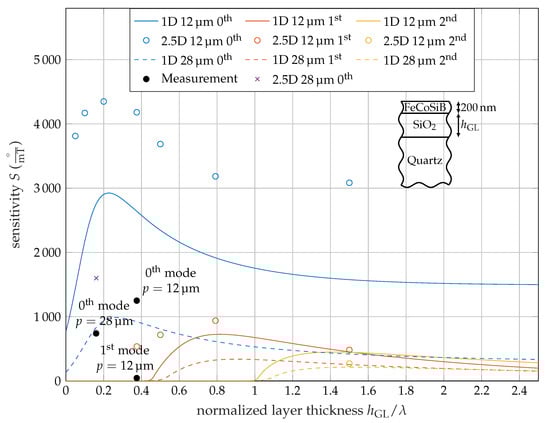 Using these equations, the overall sensitivity is calculated for different guiding layer thicknesses and IDT pitches for the fundamental, 1st, and 2nd mode. The 2.5D simulation results are added for several points in Figure 5, showing the sensitivity for different -ratios. For comparison, results from a 1D setup with same layer thicknesses but isotropic material parameters are additionally shown. Similar to the 2.5D simulation described above, the 1D simulation is split into two parts as well including the first part to determine the resonance frequency. In the second part, two simulations near the operating point are carried out using the values and as the shear modulus of the magnetostrictive layer. In contrast to the 2.5D simulation, there are no parameter sweeps necessary to find the resonances, as the differential equation [] can be solved directly. The 1D results are shown as continuous lines, since the computation time is a fraction of the 2.5D simulation.
