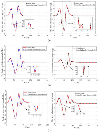The desired and controlled steering angle of the front wheel with the controller C and D at different vehicle velocities. (a) 10 m/s; (b) 15 m/s; (c) 20 m/s; (d) 25 m/s.