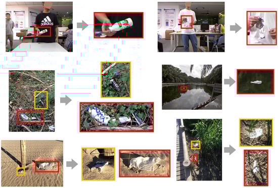 Waste objects are commonly found in both indoor and outdoor environments such as household, office or road scenes. As such, it is important for a vision-based intelligent robot to localize and interact with them. However, detecting and segmenting waste objects are much more challenging than most other objects. For example, waste objects could either be incomplete or damaged, or both. In many cases, their presence could only be inferred from scene-level contexts, e.g., via reasoning about their contrast to the background and judging by their intended utilities. On the other hand, one key challenge to accurately localizing waste objects is the extreme scale variation resulting from the variable physical sizes and the dynamic perspectives, as shown in Figure 1. Due to the large number of small objects, it is difficult even for most humans to accurately delineate waste object boundaries without zooming in to see the appearance details clearly. For the human vision system, however, attention can either be shifted to cover a wide area of the visual field, or narrowed to a tiny region as when we scrutinize a small area for details (e.g., [,,,]). Presented with an image, we can immediately recognize the meaning of the scene and the global structure, which allow us to easily spot objects of interest. We can consequently attend to those object regions to perform fine-grained delineation. Inspired by how the human vision system works, we solve the waste object segmentation problem in a similar manner by integrating visual cues from multiple levels of spatial granularity.