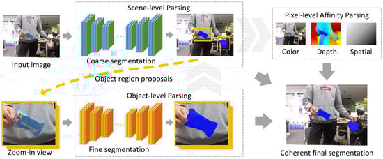 Overview of the proposed method. Given an input image, we approach the waste object segmentation problem at three levels: (i) scene-level parsing for an initial coarse segmentation, (ii) object-level parsing to recover fine details for each object region proposal, and (iii) pixel-level refinement based on color, depth, and spatial affinities. Together, joint inference at all these levels produces coherent final segmentation results.