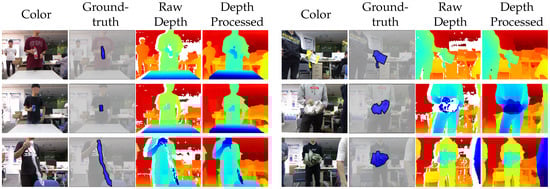 where  is the depth reading at the pixel location . We note that in practice, any missing values in  are filled in with a median filter [] beforehand, see Section 4.1 for details. In addition, Equation (9) can be conveniently added or removed depending on the depth data availability. We simply discard Equation (9) when training models for the TACO dataset which only contains color images.