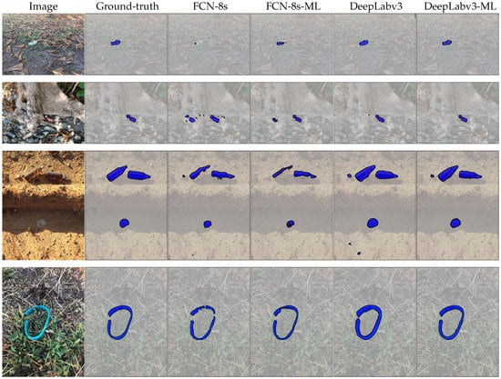 - DeepLabv3 []. DeepLabv3 proposes the Atrous Spatial Pyramid Pooling (ASPP) module for capturing the long-range contexts. Specifically, ASPP proposes the parallel dilated convolutions with varying atrous rates to encode features from different sized receptive fields. The atrous rates used in our experiments are 12, 24 and 36. In addition, we experimented with both ResNet-50 and ResNet-101 backbones on the MJU-Waste dataset to explore the performance impact of different backbone architectures.