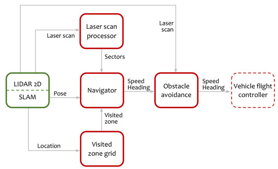 Top-level information flow diagram. In red are represented the algorithm components, in green the sensor, and in dashed line the vehicle flight controller.