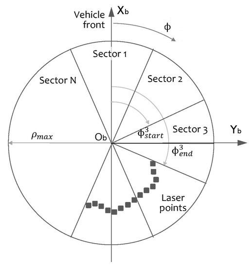 The first step is to group the laser scan points in a set of sectors using the sector angle limits. A point P belongs to sector if