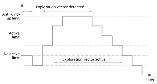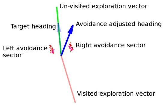 Explored area is evaluated only to check if an exploration vector is visited. Evaluation is done at a fixed distance of the vehicle independently of the modulus of the exploration vector. This distance is called the exploration radius . The exploration radius should be long enough to not be affected by the present location of the vehicle, otherwise it will be considered as recently visited and will never be explored.