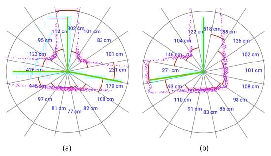 An example of the information at the end of the scan processor stage, obtained in the simulated tests, is represented in Figure 4. The magenta points are the individual laser scan points. The red arcs in the figure indicate the range of each sector, this range approximates the distance to the nearest obstacle. The green lines are the exploration vectors. These vectors show the mine passages ready to explore.