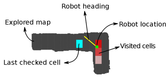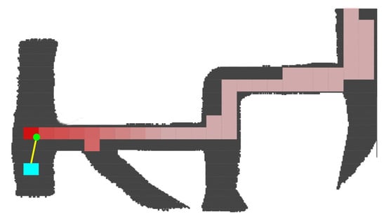 Figure 5 represents in gray the scanned mine tunnels and in red the visited zones. The gradual color changes represent the time when the vehicle occupied that position, the clearer ones being the first visited. The current vehicle position is at the small green circle, and its orientation in the sensor reference system is towards the yellow line. The cyan squared box is at the exploration radius distance from the vehicle and is where the algorithm is evaluating whether an exploring vector is visited or not.